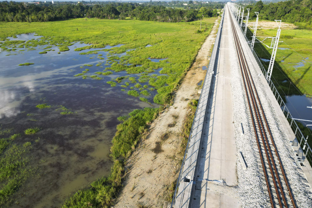 ↑10月9日,在馬來(lái)西亞彭亨州,馬東鐵軌道穿越一片濕地(無(wú)人機(jī)照片)。