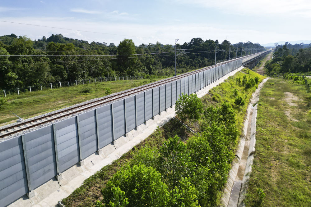 ↑這是10月10日在馬來(lái)西亞彭亨州馬東鐵項(xiàng)目拍攝的一處隔音墻,可降低噪音問(wèn)題對(duì)周邊環(huán)境和居民帶來(lái)的影響(無(wú)人機(jī)照片)。