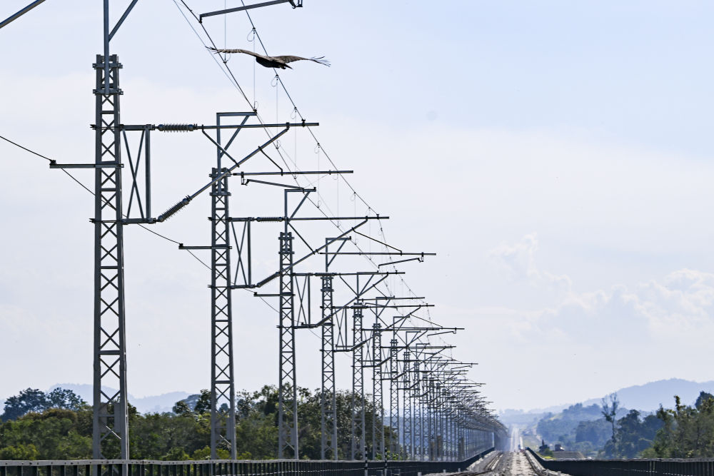 ↑10月10日,一只鳥(niǎo)飛過(guò)馬來(lái)西亞彭亨州的馬東鐵項(xiàng)目。