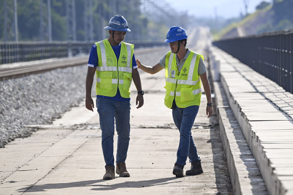 ↑10月10日,在馬來(lái)西亞彭亨州馬東鐵項(xiàng)目,環(huán)境官穆罕默德·斯亞哈丹·本·伊斯梅爾(左)和安全官何健耀聯(lián)合巡查
