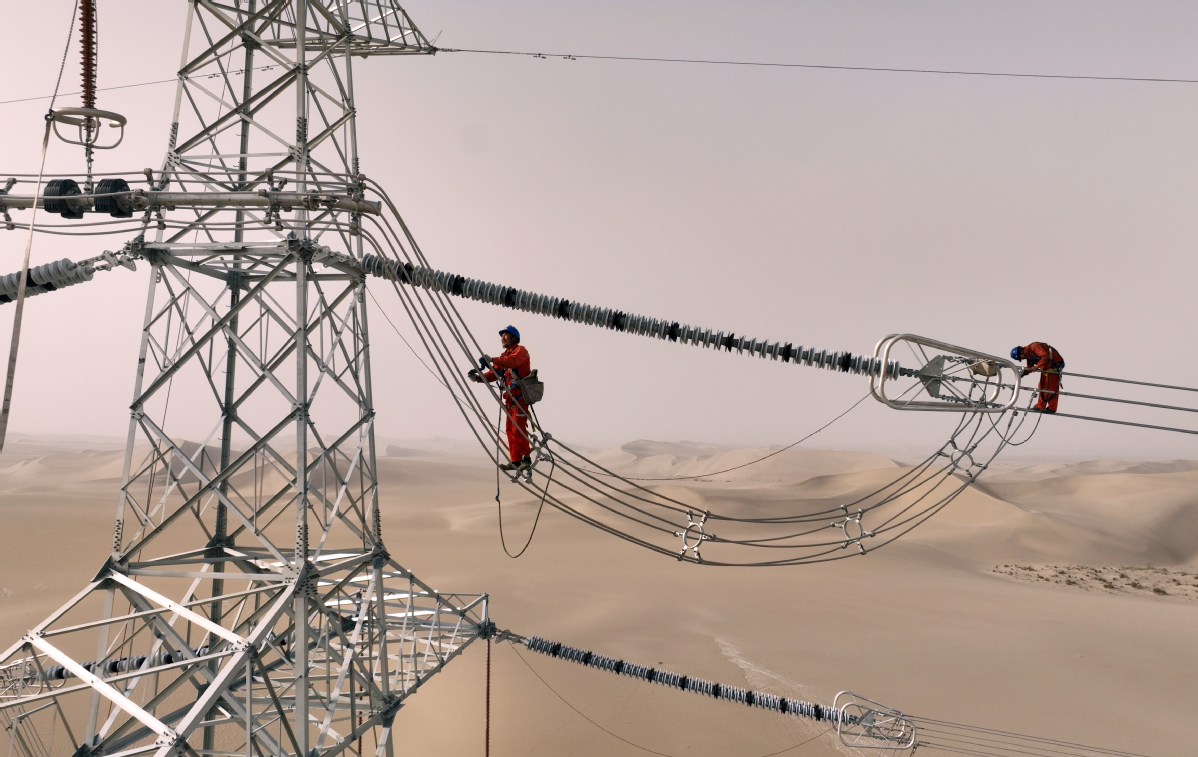 2025年6月25日,民豐—且末—若羌750千伏輸電線路工程穿越“死亡之?!彼死敻缮衬?。(馬元 攝)