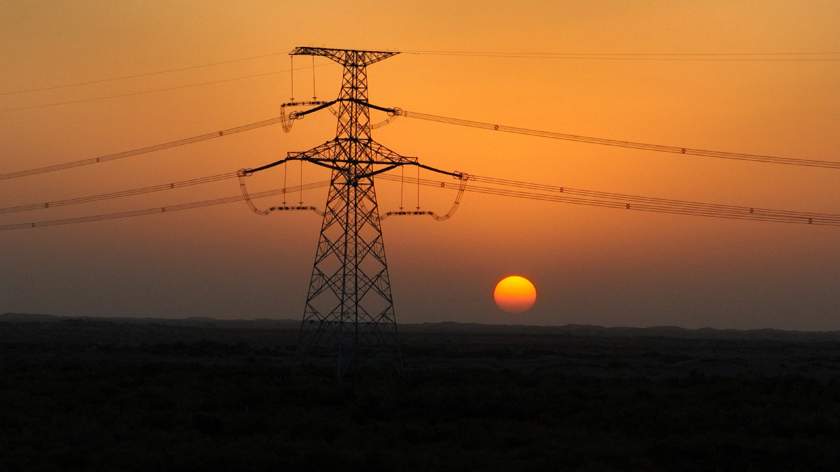 2025年10月18日,落日余暉中的民豐—且末—若羌750千伏輸電線路工程。(馬元 攝)