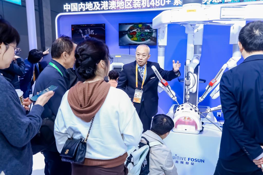 手術(shù)機器人是各家跨國醫(yī)療行業(yè)企業(yè)展示數(shù)智創(chuàng)新、產(chǎn)業(yè)協(xié)作的重頭戲。作為每年醫(yī)療展區(qū)的“明星展品”,八赴進博的達芬奇手術(shù)機器人今年首次集齊“全家福”。
