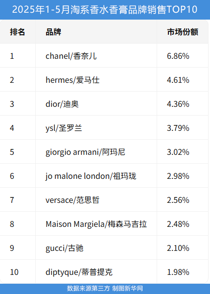 這一態(tài)勢在香水品類的重要銷售渠道淘系平臺(淘寶+天貓)的數(shù)據(jù)中也有所體現(xiàn)。國際大牌牢牢占據(jù)淘系平臺香水品牌銷售前十。數(shù)據(jù)顯示,2025年1-5月,榜單前十仍由香奈兒、圣羅蘭、祖瑪瓏等國際大牌壟斷。