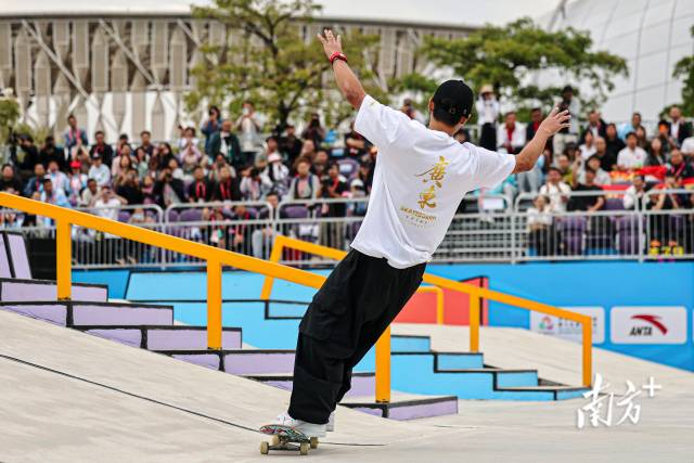 11月11日下午,十五運會滑板項目男子街式?jīng)Q賽,廣東隊潘家杰完成高難度動作后展開雙臂與歡呼的觀眾們互動。鄭新洽 攝