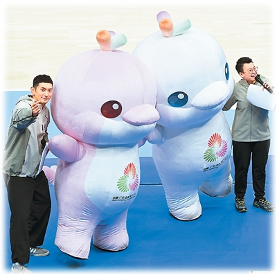 第十五屆全國(guó)運(yùn)動(dòng)會(huì)吉祥物與觀眾互動(dòng)。