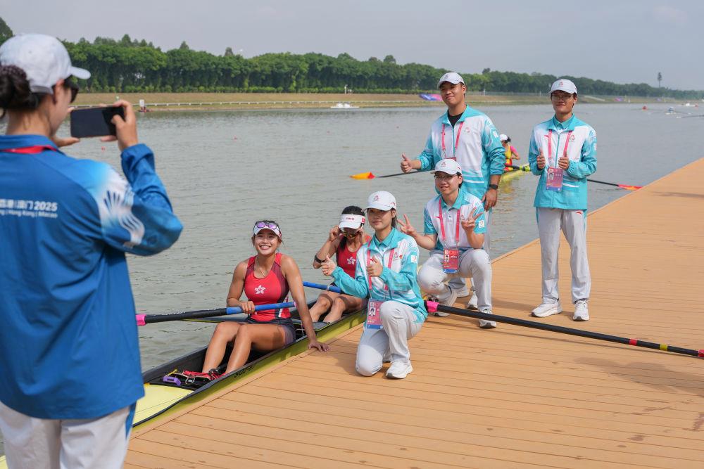 11月8日,香港隊賽艇選手黃湘儀/梁瓊允在女子雙人單槳半決賽后與志愿者合影留念。新華社記者 肖恩楠 攝