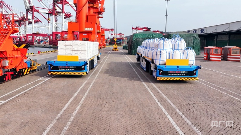 智能引導(dǎo)運輸車裝載貨物在碼頭穿梭(央廣網(wǎng)記者 唐磊 攝)