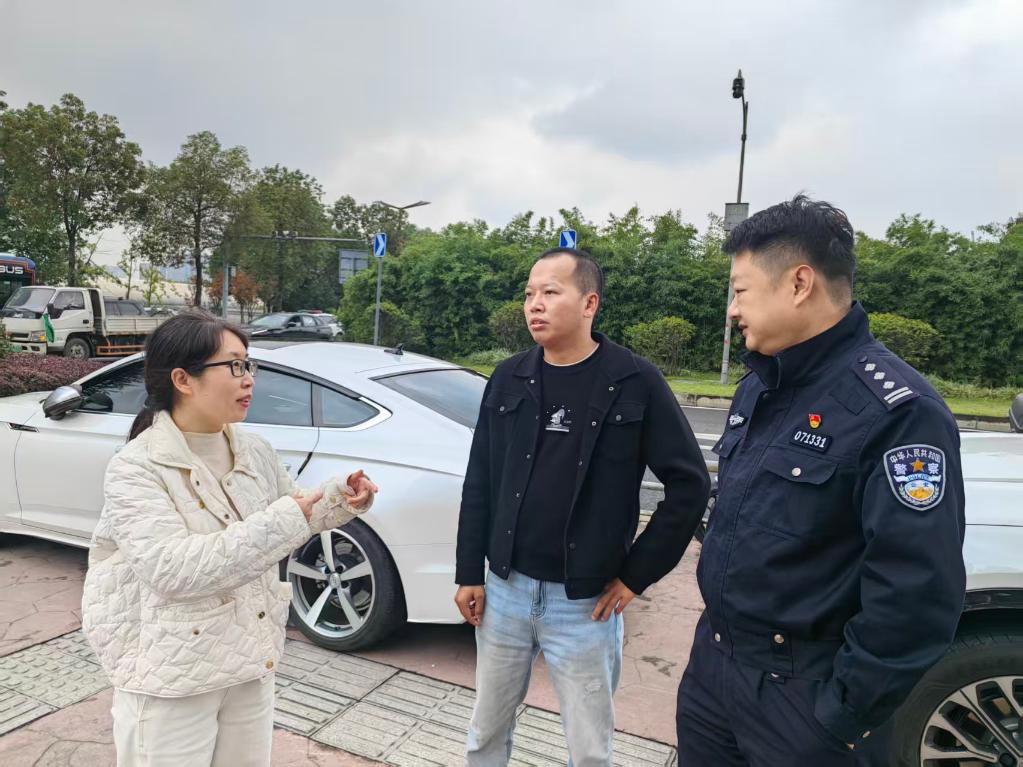 成都市民張蕓蕓(左一)和成都市公安局交通管理局第六分局民警康佳偉(右一)在改造后的路口交流。新華社記者董小紅 攝