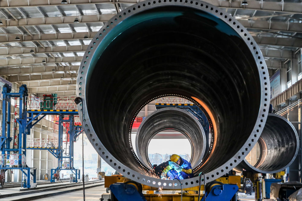 11月20日,在甘肅省酒泉經(jīng)濟(jì)技術(shù)開發(fā)區(qū)的中國水電四局(酒泉)新能源裝備有限公司塔筒制造車間,工作人員進(jìn)行風(fēng)機塔筒焊接作業(yè)。新華社記者 郎兵兵 攝
