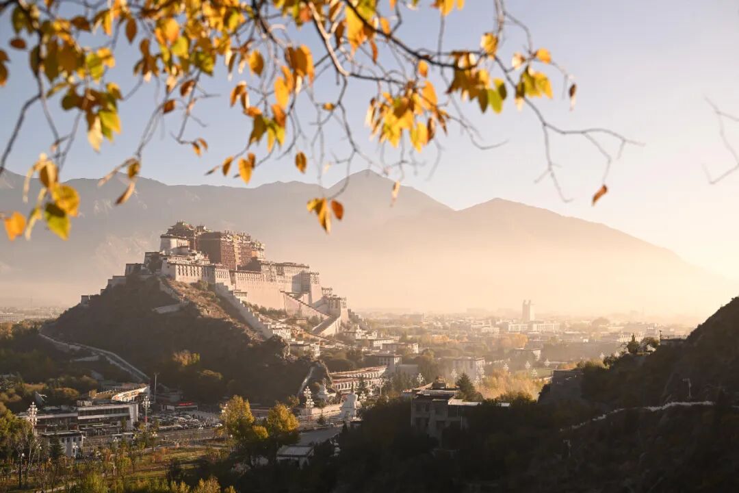 2025年10月22日清晨,薄霧尚未散盡,西藏拉薩團結(jié)公園的黃葉與布達(dá)拉宮相映成趣,勾勒出高原秋日的獨特畫卷。中新社記者 貢嘎來松 攝