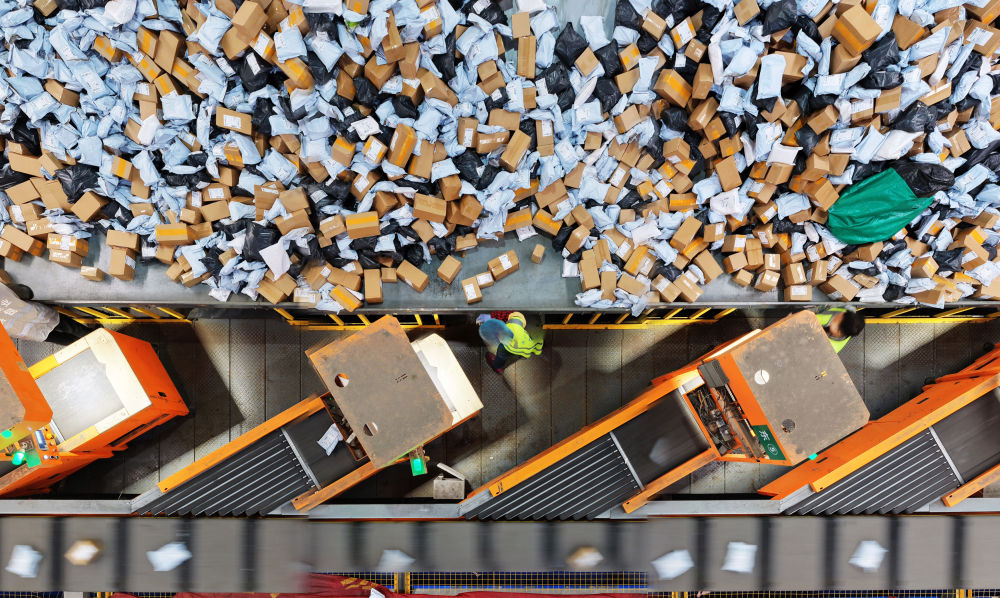 2025年11月10日,在中國郵政集團(tuán)有限公司江蘇揚州郵件處理中心,工作人員分揀快遞包裹(無人機(jī)照片)。新華社發(fā)(孟德龍攝)
