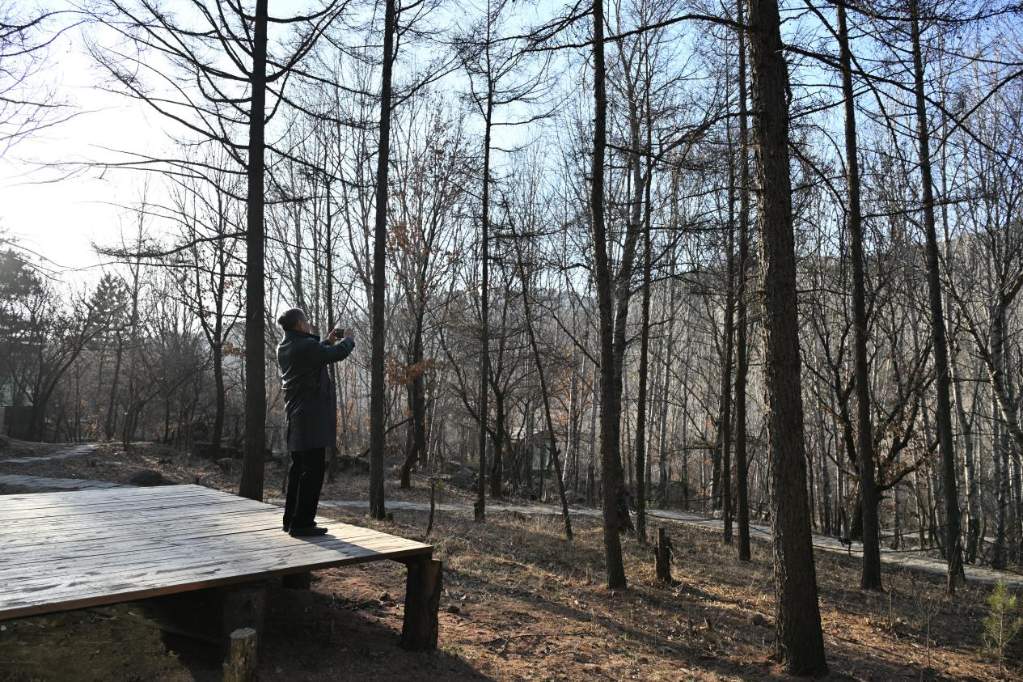 在離石大東溝森林旅游度假區(qū),張紅宇用手機記錄美景。新華網(wǎng) 發(fā)