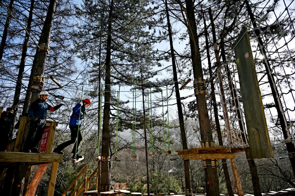 游客在大東溝森林旅游度假區(qū)體驗叢林穿越。新華網(wǎng) 發(fā)
