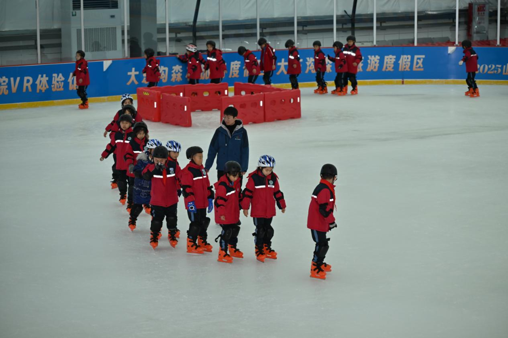 在王營莊文旅科創(chuàng)小鎮(zhèn)氣膜滑冰館,離石區(qū)一所小學(xué)的孩子們在體驗滑冰。新華網(wǎng) 發(fā)