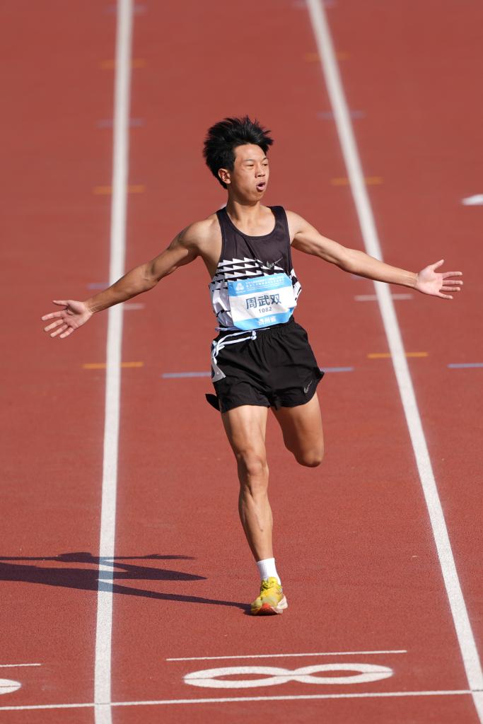 12月12日,貴州隊(duì)選手周武雙在男子12-15歲組400米預(yù)賽第4組比賽中,即將沖過(guò)終點(diǎn)時(shí)慶祝。新華社記者 楊晨光 攝