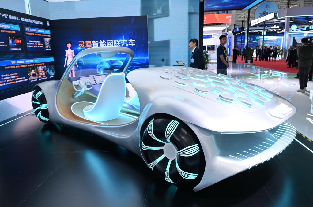 2025年4月29日,在第八屆數(shù)字中國建設(shè)峰會現(xiàn)場體驗區(qū)拍攝的靈犀智能網(wǎng)聯(lián)汽車。新華社記者 林善傳 攝