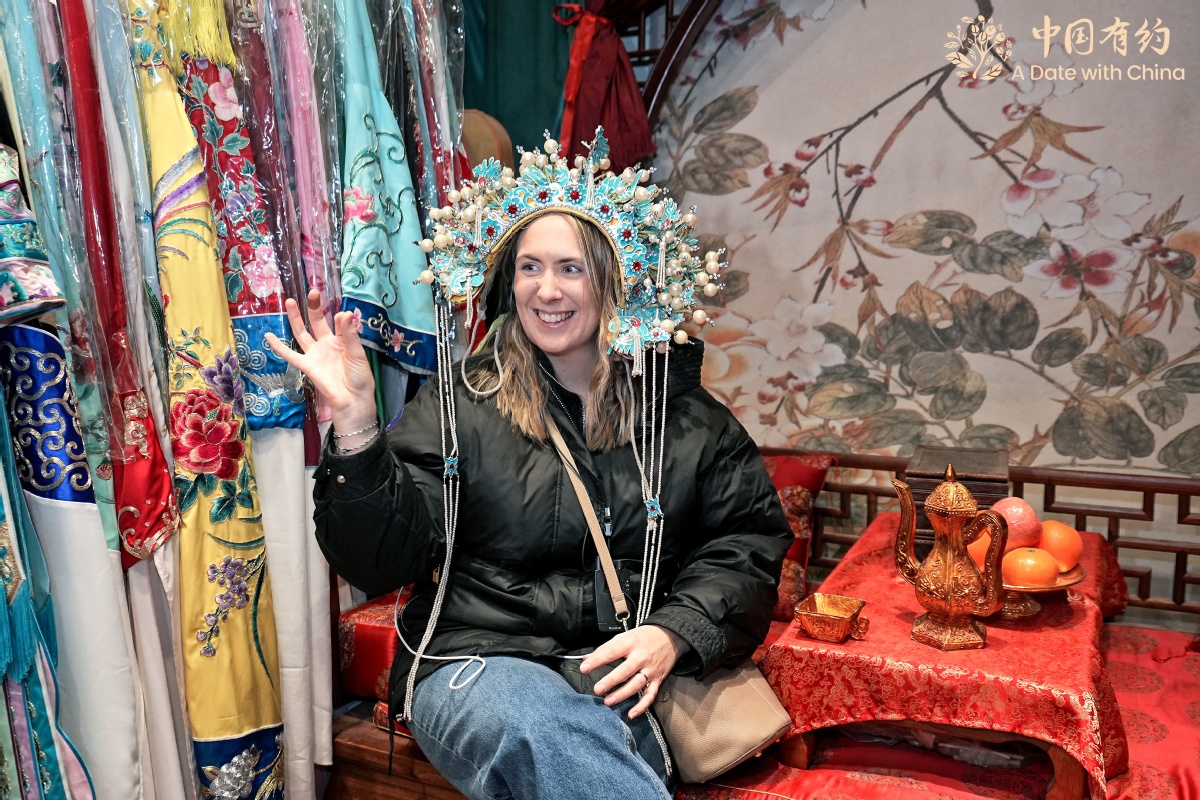 外籍友人體驗戲曲鳳冠。