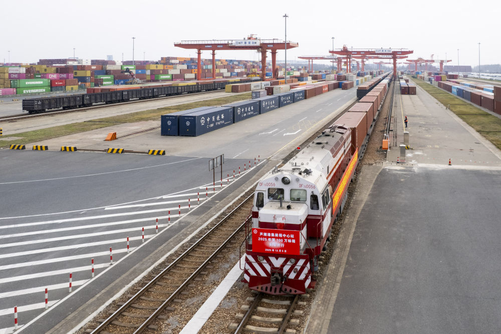 2025年12月5日拍攝的上海鐵路蘆潮港集裝箱中心站(無人機照片)。當日上午,一趟載有太陽能光伏組件、汽車零配件等貨物的海鐵聯(lián)運班列緩緩從上海蘆潮港集裝箱中心站開出,上海海鐵聯(lián)運年度業(yè)務(wù)量首次跨越百萬標箱大關(guān)。新華社記者 王翔 攝