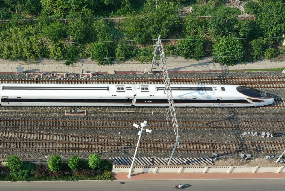 中國首條設計時速350公里的高速鐵路——京津城際鐵路開通運營15周年之際,一列京津城際列車準備駛入塘沽站(2023年7月19日攝)。新華社記者 李然 攝