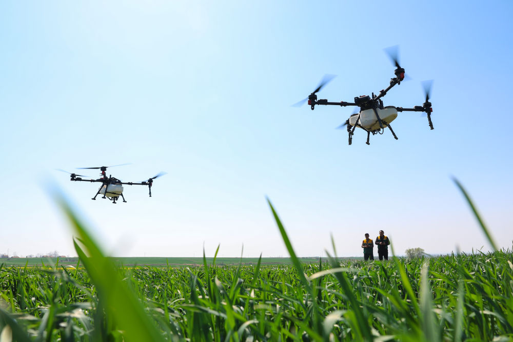 2025年3月20日,在湖北省棗陽市七方鎮(zhèn)大房村麥田里,棗陽市順輝農(nóng)機(jī)專業(yè)合作社技術(shù)人員操作無人機(jī)進(jìn)行植保作業(yè)。新華社發(fā)(楊東攝)