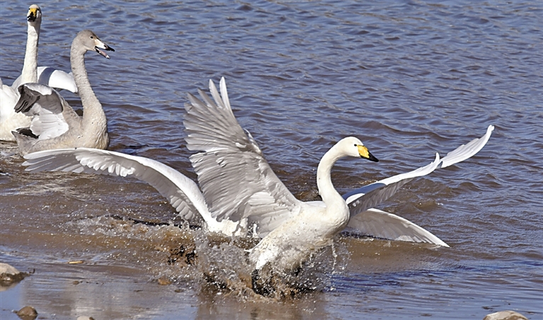 天鵝在北京密云水庫流域的清水河中嬉戲。新華社發(fā)