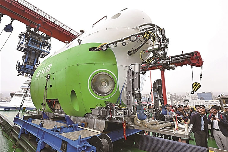 在??坑谥抢胁客郀柵寥R索港的中國“探索一號(hào)”科考船上,人們參觀“奮斗者”號(hào)載人潛水器。新華社發(fā)