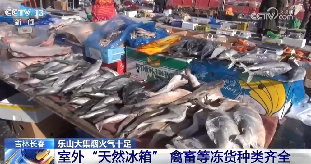 接著往里走,這里就是東北特色十足的生鮮凍貨區(qū)了。長春的冬天,室外零下20多攝氏度,堪稱“天然大冰箱”。您看這凍魚、凍豆包凍得老硬了,還有凍梨、凍柿子,都是東北人節(jié)慶團(tuán)圓必備的滋味,化透之后一口咬下去滿是汁水,清甜可口。