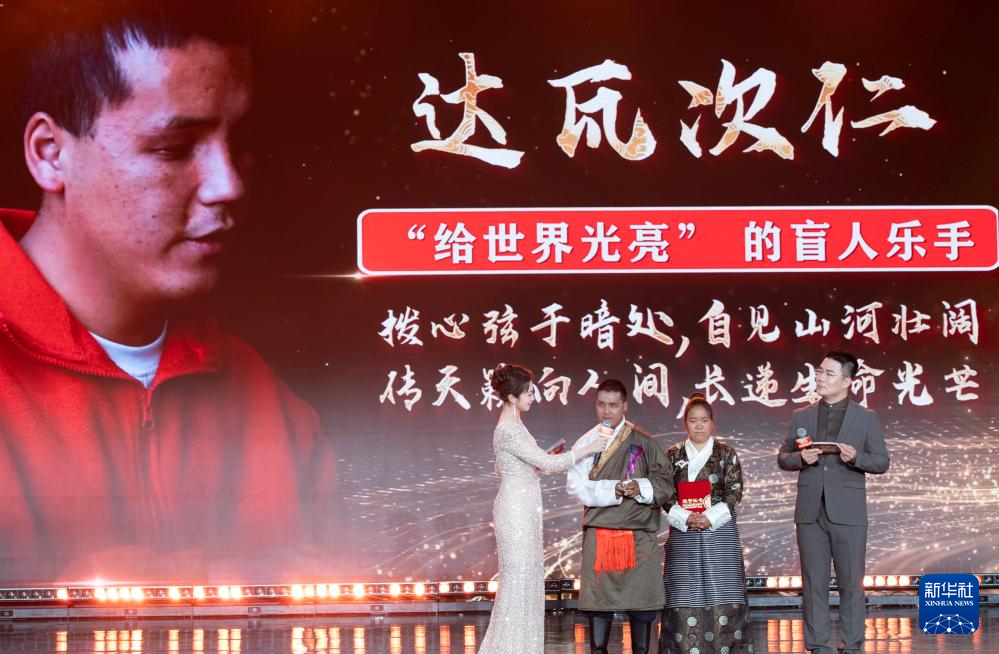 1月28日,由新華社主辦的“中國網(wǎng)事·感動(dòng)2025”公益盛典暨年度頒獎(jiǎng)典禮在北京舉行,活動(dòng)揭曉“中國網(wǎng)事·感動(dòng)2025”十大年度網(wǎng)絡(luò)人物。這是“‘給世界光亮’的盲人樂手”達(dá)瓦次仁(左二)出席頒獎(jiǎng)典禮。新華社記者 李安 攝