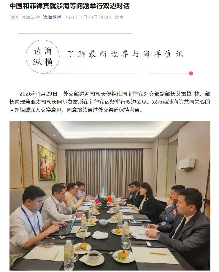 2026年1月29日,外交部邊海司司長侯艷琪同菲律賓外交部副部長艾雷拉-林、部長助理兼亞太司司長阿爾費雷斯在菲律賓宿務舉行雙邊會見。雙方就涉海等共同關(guān)心的問題坦誠深入交換意見,同意繼續(xù)通過外交渠道保持溝通。