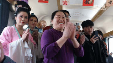 車廂里,國(guó)家級(jí)非遺沾化漁鼓戲現(xiàn)場(chǎng)開(kāi)唱。旅客們都圍攏過(guò)來(lái),在回家的路上聽(tīng)了一段地道年戲。
