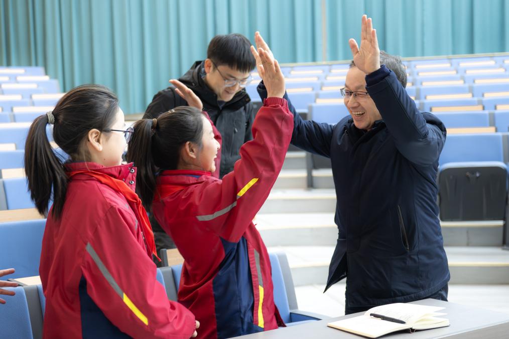 在紅安縣將軍城小學(xué),記者與參加思政示范課的小學(xué)生擊掌互動(dòng)。新華社記者 肖藝九 攝