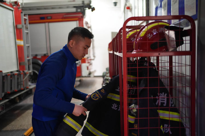 2月3日,一名消防員對消防防護裝備進行檢查。新華每日電訊記者謝晗 攝
