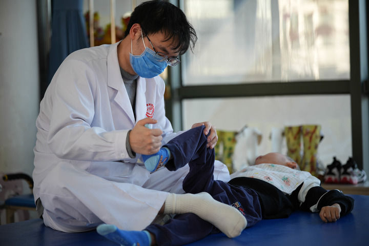 2月5日,一位福利院的老師正在給孩子進行肢體康復訓練。新華每日電訊記者謝晗 攝