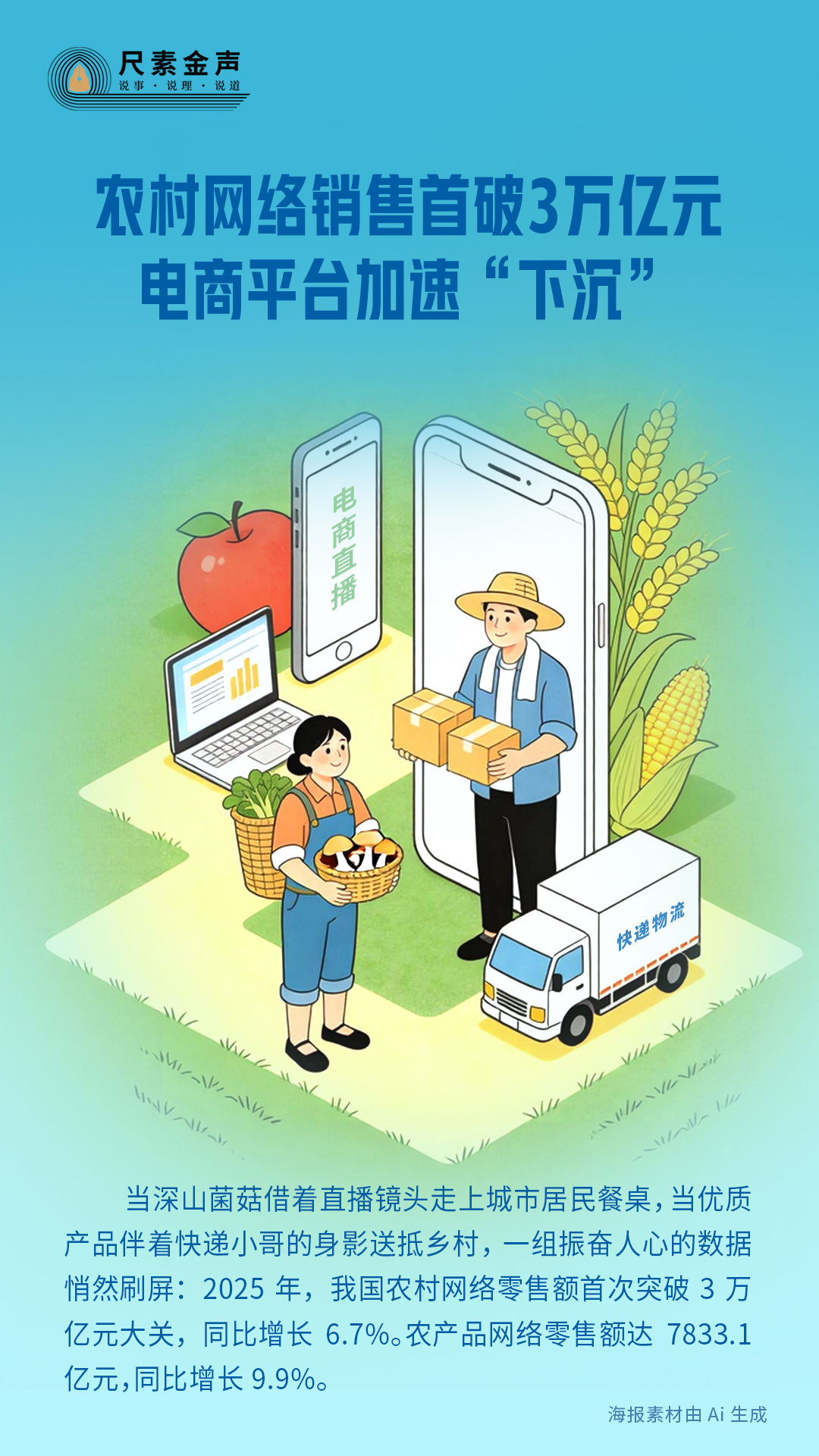 當(dāng)深山菌菇借著直播鏡頭走上城市居民餐桌,當(dāng)優(yōu)質(zhì)產(chǎn)品伴著快遞小哥的身影送抵鄉(xiāng)村,一組振奮人心的數(shù)據(jù)悄然刷屏:2025年,我國農(nóng)村網(wǎng)絡(luò)零售額首次突破3萬億元大關(guān),同比增長(zhǎng)6.7%。農(nóng)產(chǎn)品網(wǎng)絡(luò)零售額達(dá)7833.1億元,同比增長(zhǎng)9.9%。