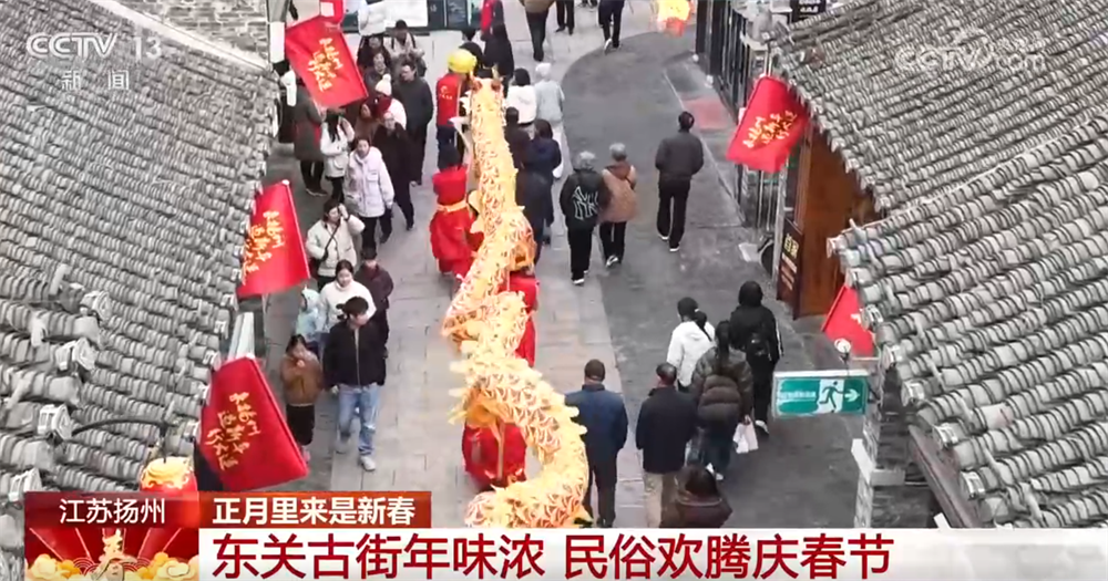 我們現(xiàn)在看到的是江蘇揚州東關歷史文化街區(qū)。春節(jié)假期,東關城門之下,舞龍表演熱鬧開場,金龍翻騰跳躍、氣勢昂揚,鏗鏘有力的音樂此起彼伏,引得市民游客紛紛駐足圍觀、拍手叫好,將新春的喜慶氛圍推向高潮。