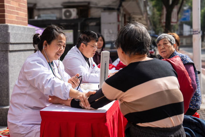 2026年3月5日,在湖南長沙市望城區(qū)高塘嶺街道雷鋒路社區(qū)雷鋒驛站,志愿者(左一)為市民測(cè)量血壓。新華社記者 陳思汗 攝