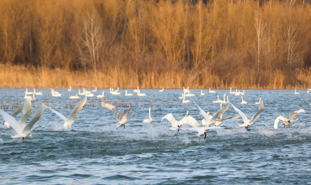 每年11月下旬至次年3月,大天鵝都會到位于黃河中游的三門峽黃河濕地越冬。據(jù)三門峽黃河天鵝湖濕地保護(hù)中心統(tǒng)計,天鵝數(shù)量從20世紀(jì)90年代的幾十只,增至如今的1.6萬余只。