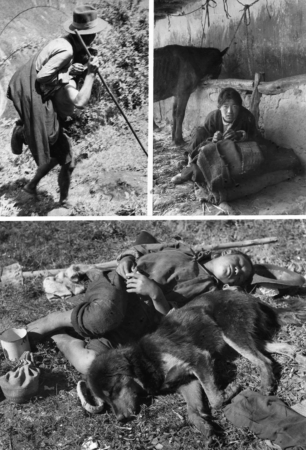 上圖左:西藏農(nóng)奴制度下的“人背人”(即農(nóng)奴像牲畜一樣背馱著農(nóng)奴主)差役。上圖右:和牲口同住的農(nóng)奴。下圖:農(nóng)奴益西欽沛服勞役后與犬同眠。新華社發(fā)(1992年9月19日發(fā))