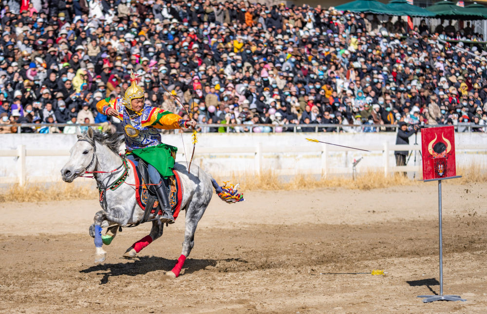 在拉薩賽馬場,騎手表演馬上射箭。 新華社記者 孫非 攝
