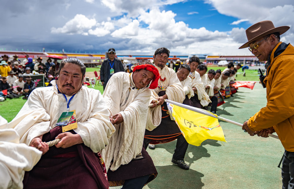 2025年9月6日,在那曲市恰青賽馬節(jié)現(xiàn)場,農(nóng)牧民參加拔河比賽。新華社記者 丁增尼達(dá) 攝