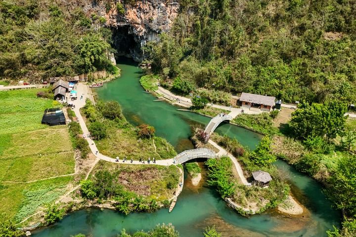 2026年3月17日,游客在云南省文山壯族苗族自治州廣南縣壩美景區(qū)游覽(無人機照片)。近年來,當?shù)厣钊胪诰驂蚊来遛r(nóng)文旅融合發(fā)展?jié)摿?,一方面打造沉浸式旅游體驗項目,讓游客在欣賞自然風光的同時,感受壯鄉(xiāng)傳統(tǒng)農(nóng)耕文化;另一方面景區(qū)積極吸納本地村民就業(yè),鼓勵其因地制宜創(chuàng)業(yè)增收,推動農(nóng)業(yè)與旅游業(yè)互促共進。新華社記者 彭奕凱 攝