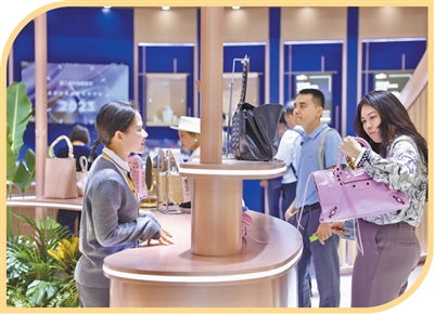 消博會(huì)免稅與高端精品展區(qū),參展人員在選購產(chǎn)品。