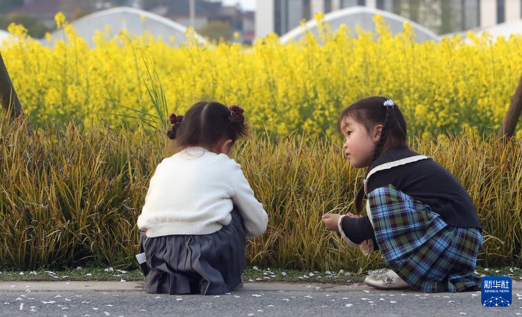 3月29日,兒童在浙江杭州“謝徑安”農(nóng)創(chuàng)村的油菜花田旁玩耍 。新華社記者 程麗 攝