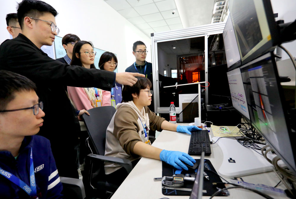 2024年4月6日,在位于安徽合肥的中國科學(xué)技術(shù)大學(xué),安徽省先進功能高分子薄膜工程實驗室團隊成員在檢修自主研制的高分子薄膜原位雙向拉伸實驗設(shè)備的電氣控制系統(tǒng)。