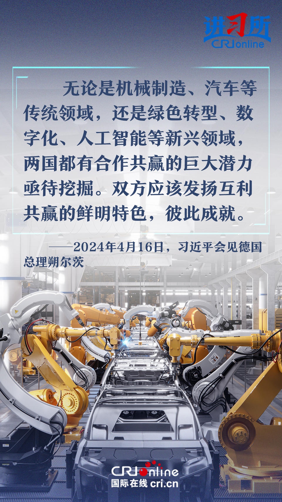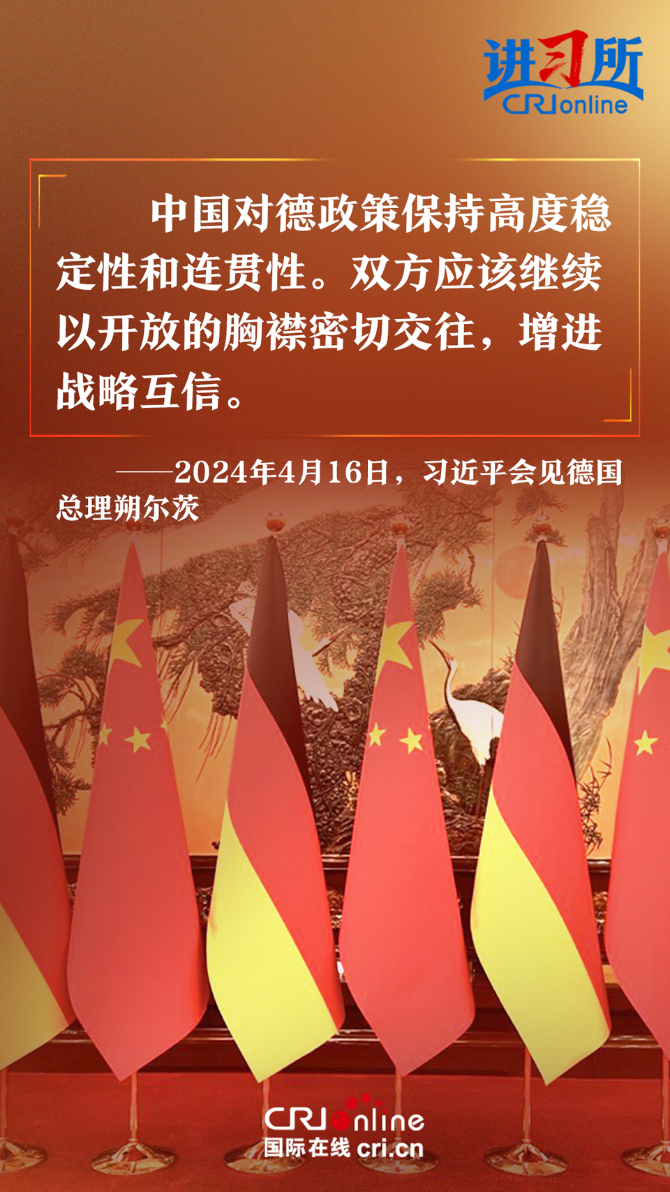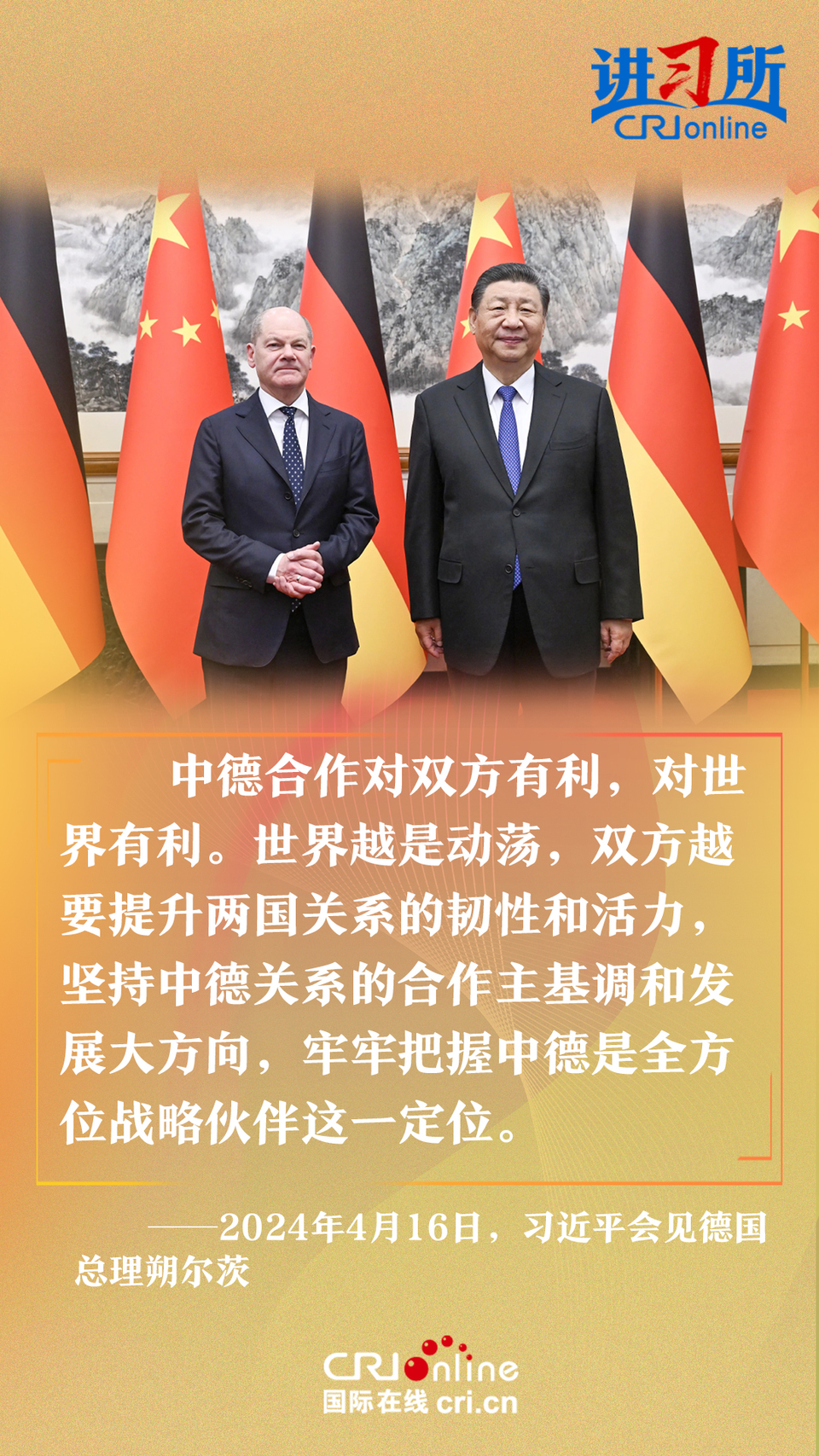 4月16日上午,中國國家主席習(xí)近平在北京釣魚臺(tái)國賓館會(huì)見了德國總理朔爾茨。習(xí)近平指出,中德合作對(duì)雙方有利,對(duì)世界有利。世界越是動(dòng)蕩,雙方越要提升兩國關(guān)系的韌性和活力。中德是世界第二、第三大經(jīng)濟(jì)體,鞏固和發(fā)展中德關(guān)系的意義超越雙邊關(guān)系范疇,對(duì)亞歐大陸乃至整個(gè)世界都有重要影響。兩國要從長(zhǎng)遠(yuǎn)和戰(zhàn)略角度看待和發(fā)展雙邊關(guān)系,攜手為世界注入更多穩(wěn)定性和確定性。