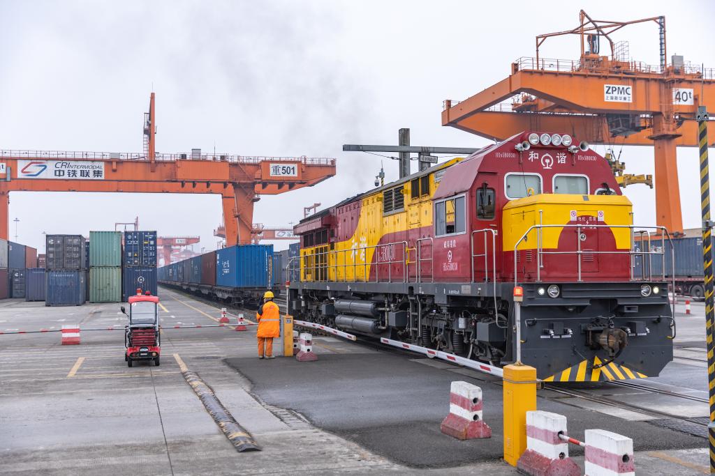 3月7日,一列滿載機械設(shè)備、整車及零部件等貨物的中歐班列在重慶團結(jié)村中心站等候發(fā)車。 新華社記者 黃偉 攝