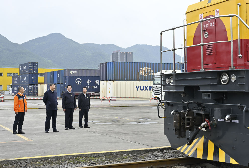 2024年4月22日,習近平總書記來到重慶國際物流樞紐園區(qū),了解當?shù)丶涌旖ㄔO西部陸海新通道等情況。在一列滿載貨物的中歐班列前,習近平總書記駐足察看。新華社記者 岳月偉 攝