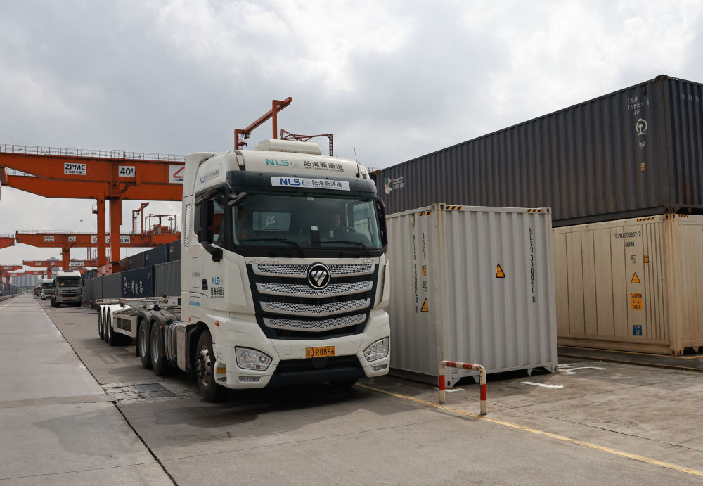 龍門吊不斷起降、轉運卡車川流不息、火車汽笛聲悠揚,各色的集裝箱整齊排放,“陸海新通道”的圖標引人注目……重慶國際物流樞紐園區(qū)到處活力涌動。