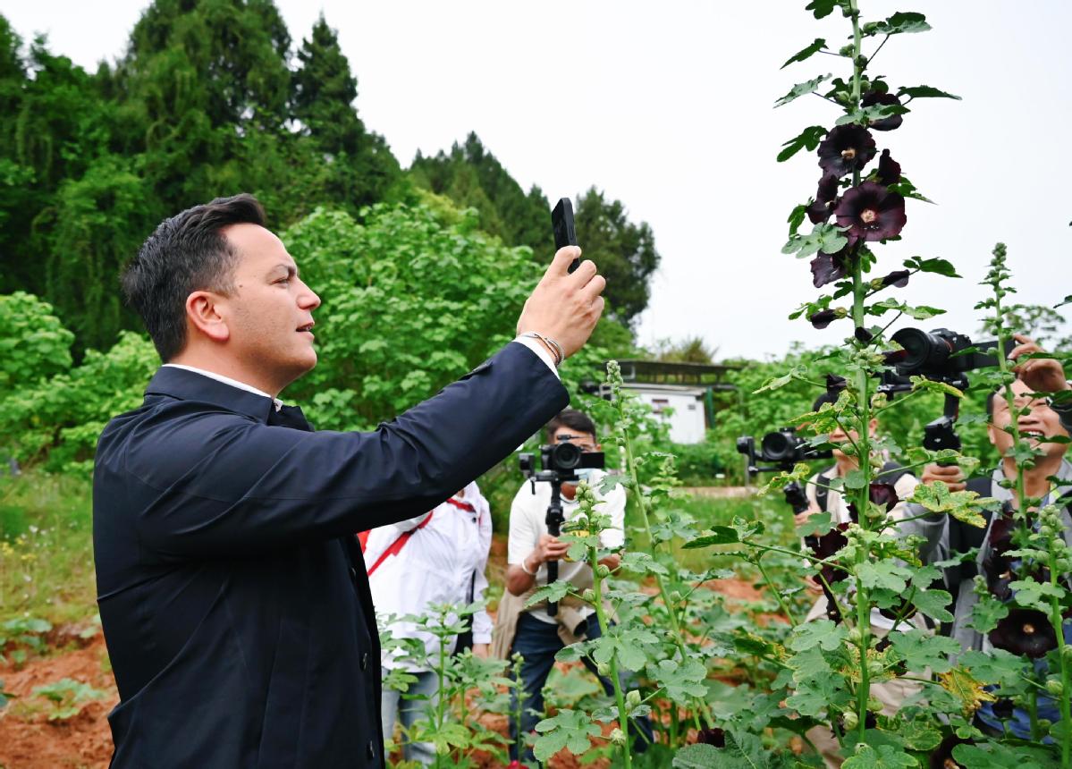 2024年4月23日,國際園藝生產(chǎn)者協(xié)會(huì)主席萊昂納多·卡皮塔尼奧在成都市金堂縣鮮花山谷景區(qū)考察蜀葵產(chǎn)業(yè)。